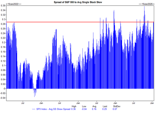 The rise in index dispersion has been well-broadcasted in correlation, but GS has been seeing the stock picker's market manifest in key vol metrics highlighting the chase for upside in single stock winners and a fade of a dramatic index rallies. The spread of SPX Index skew to the average of its constituents is in the 93rd percentile on a 1y lookback and in the 97th percentile on a 4y lookback.