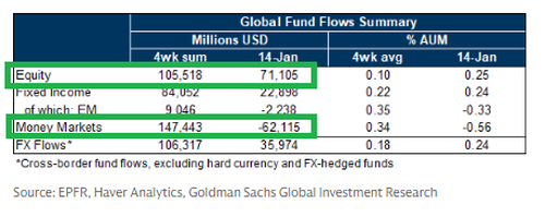 Goldman saw strong net flows into global equity funds last week, led by stronger inflows into US and EM equity funds (+$71bn vs $2bn in the previous week) – more than 35x-ed the flows. While equity flows increase, money market fund assets fell by $62bn. This is the 3rd largest level in the bank's dataset.