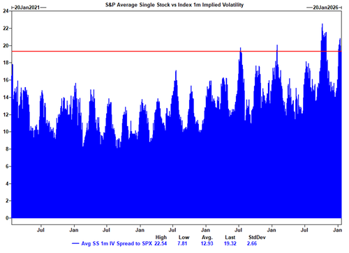 The spread of SPX average single stock 1m implied volatility to the index is in the 89th percentile on a 1y lookback and in the 97th percentile on a 5y lookback