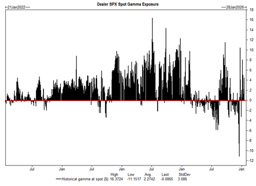 Following yesterday's selloff, dealer gamma positioning has gotten cleaner, and dealers are max long S&P gamma +3% from here: a relief rally will send the market straight back into a gamma pocket and calmer skies. Until then, buckle in for a bumpier ride.
