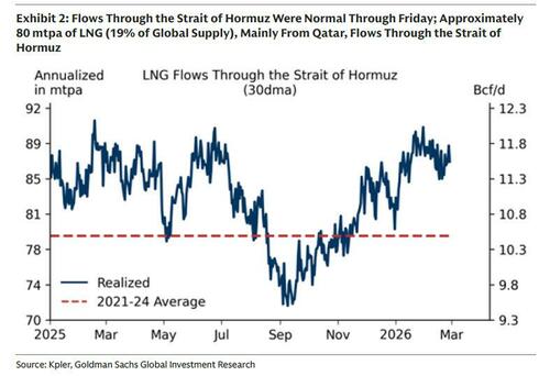 While flow data through the Strait of Hormuz through last Friday point to somewhat above annual average volumes for oil (Exhibit 1) and for LNG (Exhibit 2), there have been reports over the weekend of large drops in the number of tankers crossing through the Strait, and of three oil tankers reportedly damaged in the region. We think traffic may remain disrupted until there is further clarity on risks (e.g. mines, strikes). We assume no sustained flow disruptions in our baseline energy price forecasts, which we have left unchanged for now, and we will continue to monitor high frequency flows through the Strait closely.