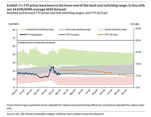 Differently from oil, we believe that until this past Friday, European natural gas prices had embedded little-to-no risk premium associated with Iran-related geopolitical risks. Specifically, TTF has been pricing in the bottom half of our estimated hard-coal-to-gas (C2G) switching range for the past month, modestly below our 36 EUR/MWh March 2026 TTF forecast (Exhibit 11). Once accounting for the recent sell off in carbon emission prices to below the 80 EUR/t embedded in our TTF price forecast, worth 2.0-2.5 EUR/MWh in gas-equivalent terms, prompt gas prices are still largely in line with our view that TTF needs to be in this C2G switching range to help manage NW European gas storage to above 80% full by end-Oct26, given that current inventory levels remain well below average. That remains our view, and we maintain our 34 EUR/MWh balance-of-the-year TTF price forecast.