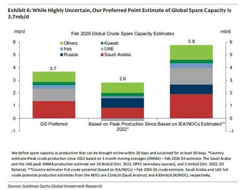 While highly uncertain, our preferred point estimate for global spare capacity is 3.7mb/d, largely concentrated in Saudi Arabia and the UAE (Exhibit 6). A hypothetical sustained closure of the Strait of Hormuz would be a physical impediment to OPEC's ability to deploy this spare capacity. Today, OPEC+ also announced it would raise required production by 0.21mb/d in April, slightly above our 0.14mb/d expectation.