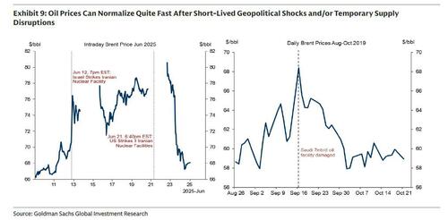 While the scale and length of any potential disruption to oil flows from the Middle East and via the Strait of Hormuz remain uncertain, we have not changed our baseline oil price forecast for now, and still expect Brent/WTI prices to decrease to $60/56 by 2026Q4 (assuming no sustained supply disruptions). While the risks to our forecast are skewed to the upside, history suggests that price spikes driven by geopolitical shocks or/and temporary supply disruptions can be short-lived (Exhibit 9).