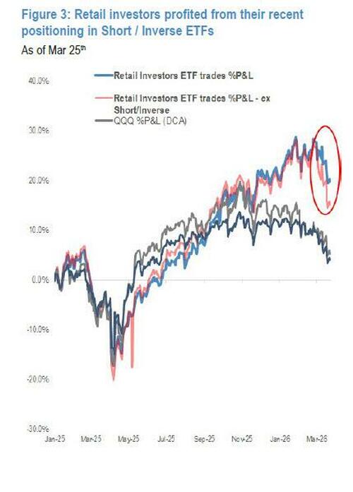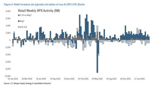 Echoing our observations, JPM writes that Monday stood out as particularly weak: despite a broader return to market enthusiasm, retail appeared to capitulate — turning net sellers for the first time in 9 months as they "sold the rip", led by a 3.6%ile day in single names. For the full week, retail flows declined further to $3.0B, below the 12-month avg of $6.8B/week. Retail investors continued to favor ETFs (+4.4B) over Single Stocks (-$1.4B).