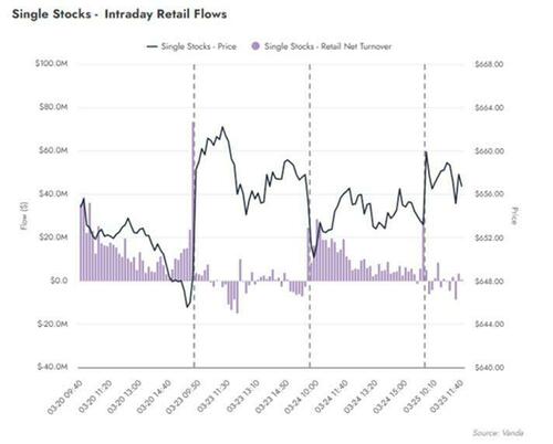 Two days ago, in a post titled "Buy The Dip" Is Dead", we wrote that when looking at the latest retail data from Vanda Research following Tuesday's powerful rip in stocks, we said that despite Wednesday's powerful morning meltup which was driven by ceasefire optimism, "the retail bid was notably absent today" and noted that in the first 2 hours of trading, "instead of buying, retail actually sold $5.5mn of US-listed single stocks"