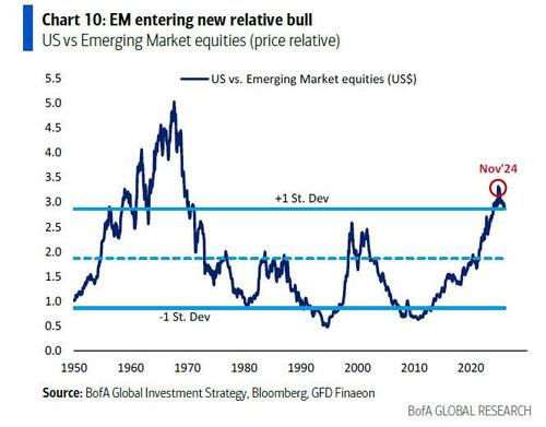 And turning from the current bull market to what Hartnett believes will be the next big bull market of 2026 beyond, the strategist says that new secular bull in International stocks in year two driven by end of deflation in Europe, Japan, China + Trump forcing Europe, Japan fiscal excess in 2020s… it's why there is big rotation out of bonds into bank stocks; Looking ahead, for 2026 Hartnett says say Emerging Markets will join the secular international bull, while strong commodity prices (powering the AI build-out) = stronger EM FX = lower EM bond yields = EM stocks entering new relative bull).