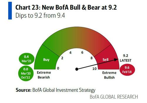 In recent weeks (here and here), BofA's Michael Hartnett has been explaining to clients that - under normal circumstances - the time to sell stocks (and short the market) would be here, now, especially considering that the BofA Bull & Bear indicator is in record, 9.2 territory...