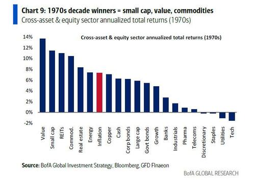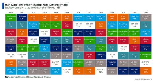 And echoing what we noted above, while the first half of the 2020s saw a bond bear market which sparked an ABB bull in gold, EU/JP banks, US tech/Mag 7; Hartnett thinks H2 2020s will see small/mid cap stocks and Emerging Markets new beneficiaries of ABB… same as in 1970s when wage & price controls, pro-cyclical fiscal/monetary policies, US$ debasement (end of Bretton Woods) caused peak of Nifty 50 bull market in 1972 and gold (1971-74) replaced by small cap (1975-77) as best asset to own.