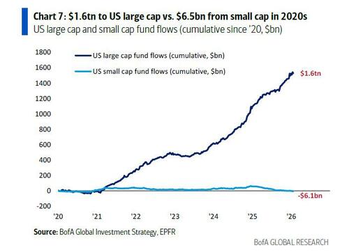 - Positioning: decade-to-date $1.6tn inflow to US large cap vs. $6.1bn outflow from small cap