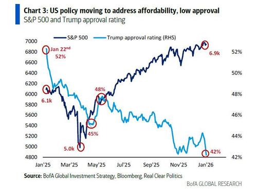 - Politics: Trump aggressive pivot to address affordability (Trump approval 42% new low last Friday) not by monetary, fiscal, trade policy, nor asset prices, but by aggressive government intervention (our “invisible hand to visible fist” view) in corporate sectors to control prices…