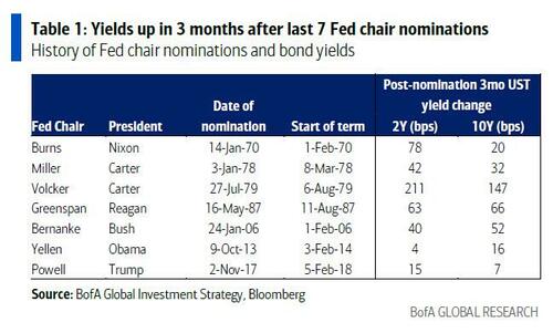 With the time until the next Fed chair arrives at the Marriner Eccles building fast approaching, Hartnett reminds us that 3 months following seven nominations for Fed Chair since 1970 (Burns, Miller, Volcker, Greenspan, Bernanke, Yellen, Powell), yields up every time (2-year +65bps, 10-year +49bps)...