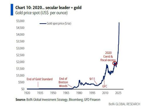 - 2020: COVID, era of monetary (QE) and fiscal excess (US govt spend +56%), big nominal GDP growth (>50%), US exceptionalism… leaders gold...