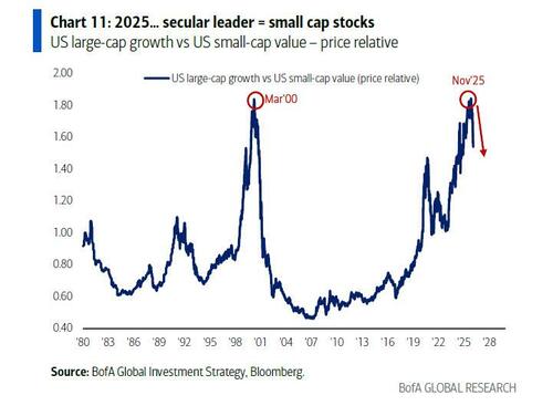 long Main St plays, e.g. EM, small cap, banks, REITs, and other assets punished in the first half of the 2020s by big bond bear market; Hartnett expects that 2026 inflation surprises downside as AI chills labor market, and politicians address voter concerns over affordability; it's why Trump aggressive intervention to reduce price of energy, healthcare, credit, housing, electricity via Big Oil, Big Pharma, Big Banks, Big Tech means small & mid-cap best play for "boom" on Main St in run-up to US midterms; plus flip from asset-light to asset-heavy business model suggests major threat to 2020s market leadership of Big Tech/Magnificent 7…