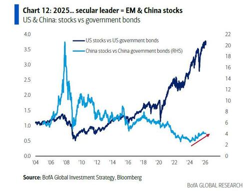 Hartnett writes that when it comes to Bonds: zero-coupon bonds ZROZ up 4% YTD, Nasdaq 100 QQQ -2%; he still thinks big unwind levels hold (big tech XLK $133, bitcoin 58k, gold $4550/oz) but if bonds rally more after strong payroll an d Friday's s CPI… those levels will be tested again, especially now big financials breaking down (XLF<$52.50). This would open the door for wider credit spreads, and Hartnett believes the long bond remains best 2026 risk hedge, as the Trump admin is unlikely to allow GT30 to trade above 5%, while the Fed may be done which means yield curve steepening done (everyone has a steepener on). To this add in the electoral need to address affordability in ’26, acceleration of deflationary AI disruption, and the BofA strategist thinks that a government bond yields surprise to the downside is his favorite exposure for ‘25-‘26 inflation-hiatus (and yes, inflation will come roaring back up in 2027 after US midterms, where with a laundry list as to why “Anything But Bonds”, ABB will remain the correct secular (not cyclical) investment theme of 2020, with some factors of note:
