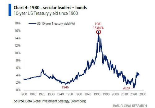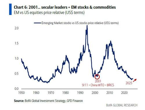 Looking ahead, Hartnett predicts that the next great rotation/secular leaders will be Emerging Markets and small cap stocks: