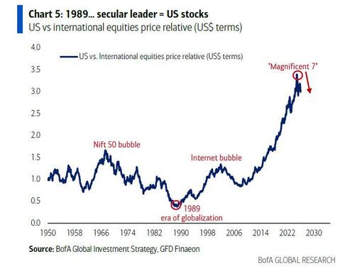 - 1989: fall of Berlin Wall, start of era of globalization, disinflation… secular leader US stocks (in 1989 hit lowest level vs global stocks in past 75 years), laggard commodities (copper only asset to record negative annual return in 1990s);