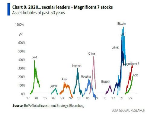 To Hartnett, nothing says “secular bull” more than FX up, stocks up (see Japan '82-'90, Germany '85-'95, China '00-'08); but in the short-term, the strong Japan yen adds to crypto, silver, PE, software, energy, unwind pain; it also means that Japan can’t have disorderly yen surge now (i.e., JPY below 145) as it will crush Japanese exporters (and their stock), will hit global liquidity, and has always coincided with global deleveraging.