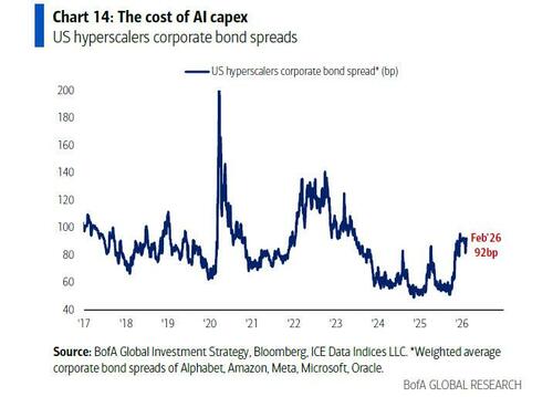 To those wondering what may short-circuit this AI sector nuke fest, recall what we said tin "Bond Market Faces Historic Shock As Mag 7 Giants Turn Cash Flow Negative To Fund CapEx Tsunami", namely that hyperscaler capex is now expected to reach a mindblowing $740BN in 2026...