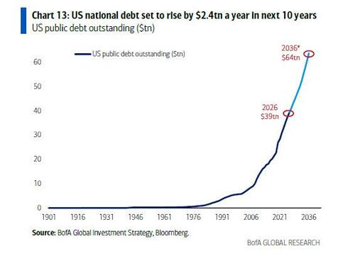 - US national debt (>$40tn by midterms) rising $1.0tn every 100 days, and hitting $64 trillion by 2036