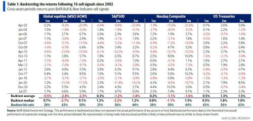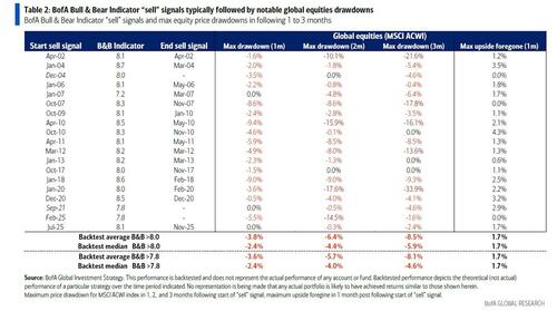 For context, the strategist does a backtest to find that the 16 sell signals since 2002 have been followed on average by 2.4% loss in ACWI, while the max drawdowns in 1 month, 2 months, 3 months after sell signal = 4%, 6%, 9% respectively (vs. max upside foregone <2% - see Table 2). Finally, the hit ratio is 63% but the last two triggers were notable misses, with stocks surging both in Dec 2020 and July 2025 when the Bull and Bear sell signal was triggered the last two times.