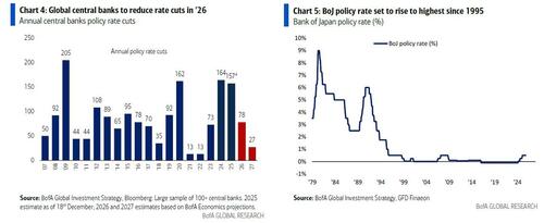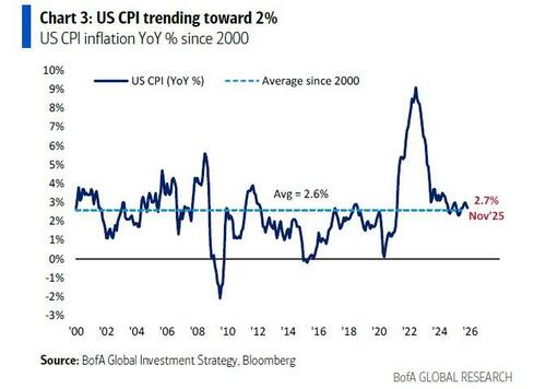 Fast forward to the latest Flow Show, and last for 2025, note (full report available to pro subs), in which the BofA strategist echoes the main points from last week's Flow Show, and repeats the trading playbook for the first half of 2026 is framed on the upper end by such bullish "positive surprises" as CPI dropping to 2%...