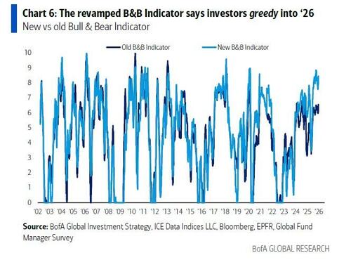 According to Hartnett, the BofA Bull & Bear indicator rises from 7.9 to 8.5, triggering the contrarian “sell” signal for risk assets (triggered on huge inflow to equity ETFs, rising global stock index breadth, hedge funds cutting length in VIX futures). For those unfamiliar, a Bull & Bear Indicator reading >8.0 = extreme bullishness = contrarian sell signal.