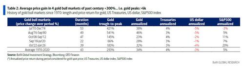 And while there are always strong pullbacks in overbought bull markets, one can also make the case for higher allocation to gold intact (currently only 0.6% for BofA high net worth clients); and since the average price gain in the 4 gold bull markets of past century ≈300%, would indicate that gold peaks above $6K.