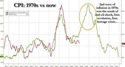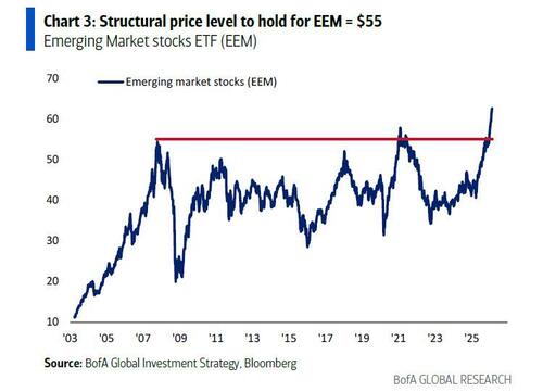 Once de-escalation comes, what then? Hartnett writes that de-escalation (+ Trump-Xi trade deal) = sell oil $90/bbl, sell US$ >100 DXY, buy 30-year UST @ 5% + risk troughs March; That said, the BofA strategist expects no new equity highs without bear positioning and policy panic to reverse peak liquidity. He also notes that a "short war renews bid for inflation boom beneficiaries… commodities, EM small cap as the US dollar bear market resumes."