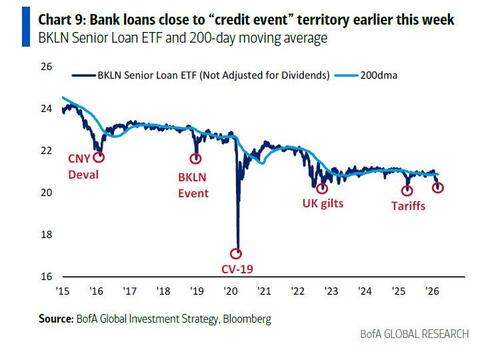 ... and “long SOX-short IGV” trade (“AI awe>AI poor”) trade. More big picture, a trough in software = trough in private credit & bank loans. Until then, Hartnett echoes what he said last week, namely that it is crucial for IGV to hold $80 & BKLN to hold $20 Feb lows (as a reminder, bank loans traded close to “credit event” territory earlier this week).