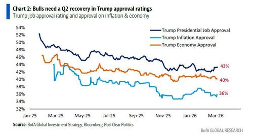 ... and now the president must reverse a 45% surge in US oil prices, 15% jump in gasoline prices, which means a lengthy Iran conflict is not feasible. The market is facing a similar quandary: according to the BofA CIO, a recovery in Trump approval rating ahead of the midterms is needed for Q2 upside, or as he puts it "bulls want “populist capitalism” not “populist socialism”.