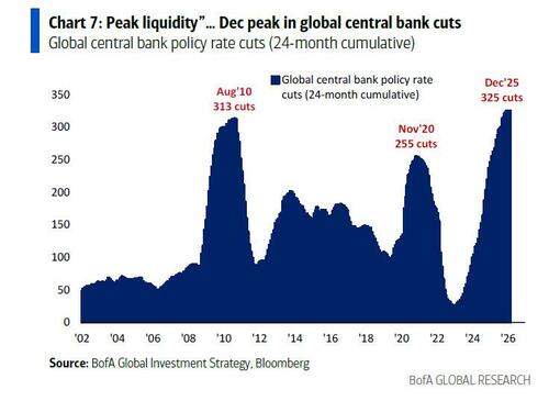 For the Bank of America strategist, the key asset to watch is the US dollar, which is the best global liquidity barometer: a decisive DXY index break higher >100 would mean the “peak liquidity” theme is deepening the December peak in global central bank cuts, pricing out ’26 rate cuts (probability of June 17th Fed cut was 100% Jan 1st, now 37%), yield curve flattening & potential inflationary oil shock.