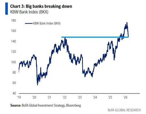 Taking a closer look at just it is Wall Street is trading, in his "Tale of the Tape" section, Hartnett writes that the soaring oil is tightening financial conditions, and a Fed cut is being priced out (June was 100% probability, now 25%); Yet the BofA strategist warns that a bigger risk for stocks is EPS not CPI; that's because big banks are the glue between Wall St & Main St and one can’t buy cyclicals when banks breaking down (BKX <150) on fears of the great private credit bubble unknown.