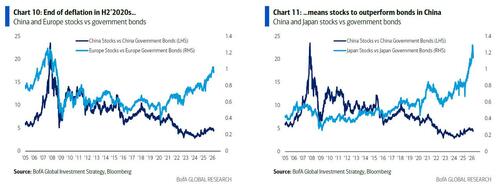 - China: Hartnett would buy China equities as inflation is rising (core CPI 1.8% = highest since 2019), fiscal spending rising (China targeting record deficits of 4% GDP in ’25 & ’26 – and need to counter new China threats from Iran oil, Belt & Road, US Pax Silica policy2 = more stimulus), and bond yields rising (30-year yield up 50bps past 12 months)… As a reminder, the end of deflation in Japan & Europe (latter aided by Russia/Ukraine) saw H1’2020s secular outperformance of stocks over bonds…China story in H2’2020s; oil, rate hikes, EPS risks… all say growth>value short-term (Mag7>banks) but fiscal narrative of New World Order means New World Bull in International.