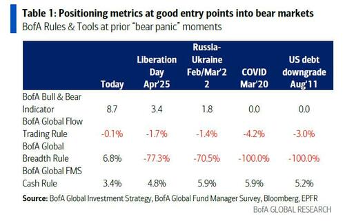 If the March FMS shows that cash levels jumped above 4% after being record low just months ago, and growth expectations turn negative, then Overweight stock allocation will drops from 48% to <20%. Which, incidentally, we already confirmed earlier in 'Record Liquidations: Institutions Just Sold The Most S&P Futures Ever." To Hartnett, such a surge in bearish sentiment will be first sentiment signs that we are close to lows.