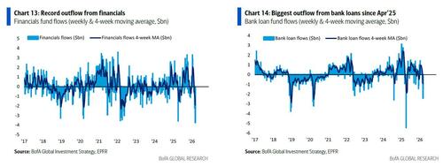 Moving from traders to investors, Hartnett has more bad news: yes, the BofA Bull & Bear Indicator has peaked, risk-off outflows are more visible in US HY bonds, EM debt, and especially financial stocks (see record outflow this week)...