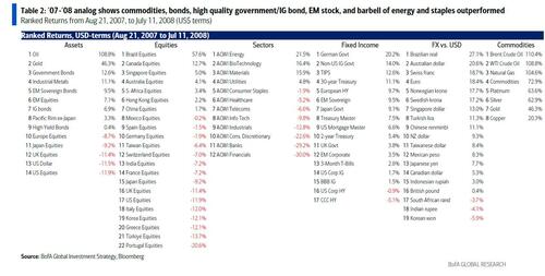 Echoing what we said at the very top (and first on Wednesday), Hartnett concludes that asset performance in 2026 is more ominously close to price action seen from mid’07 to mid’08…. then the oil surge was demand-led (China & India) not supply-led, like 1973 (unlike 2022) credit availability tightened, and combo of oil & credit shocks meant correct asset allocation was for commodities (oil, gold) over financial assets, bonds over stocks, high quality government/IG bonds over HY, EM stocks over US, barbell of energy & staples over banks & tech.