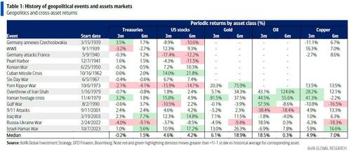 Just don't overstay your welcome: as the next table shows, following geopolitical shocks in past 90 years oil is the best performer over 3 months (up 18%), then gold (6%) US stocks (4%); but 6 months after geopolitical shocks gold keeps outperforming (up 19%), stocks stall, while oil reverses all gains. Or as Hartnett puts it "Rock the Geopolitics = trade oil, own gold."