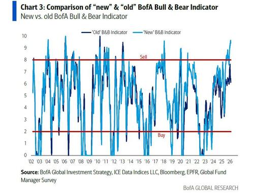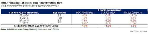Finally, extending on the latest Fund Manager Survey finding of extreme positioning and profits, Hartnett writes that the BofA Bull and Bear indicator dips a fraction, from the record 9.5 to 9.4; That said, the Bull & Bear Indicator still reads “extreme bull”, and is near the highest since Jan'18 on sustained inflows to global stock ETFs & tech funds, strong global stock index breadth (75% of ACWI markets trading >50 & 200dma), bullish BofA Global FMS positioning (e.g., cash levels 3.4%) partially offset by outflows from EM debt, hedge funds turning net long VIX futures; Bull & Bear Indicator moved to >9.5 on Feb 3rd, only 3 times past 25 years (Jan'04, Mar'06, Jan'18). All of those episodes were followed by notable market shows...