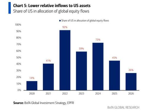 Looking at the Big Flow to Know, Hartnett calculates that in 2026, for every $100 of inflows to global equity funds, US stocks have accounted for $26, their lowest share since 2020...