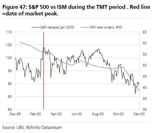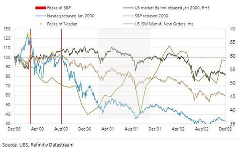 iii) the bear market for the S&P occurred as we moved into a recession (the 22 point collapse in ISM new orders from 60 to 38 between January 2000 and January 2001 with a recession starting in Feb 2001);