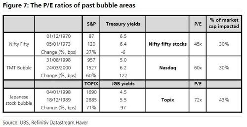 i) The P/E rises to c45X to 73X for at least 30% of market cap on a 10 year bond yield of, at least, 5.5% in previous bubbles. Currently, the Mag 6 trade on 35X 12 month trailing;