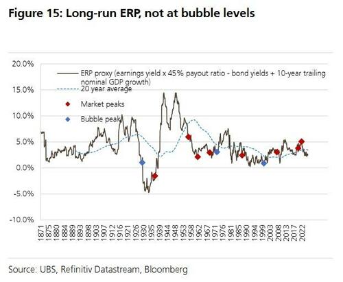 So with Wall Street CEOs trying to be sanguine, but admitting there is risk, UBS Equity Strategist Andrew Garthwaite and his team investigate 'how much of a bubble we are in' and explain what the warning signs of a peak look like from here...