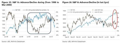 iii) much larger loss of breadth (in 1999 nearly twice as many stocks fell as rose despite the Nasdaq nearly doubling);