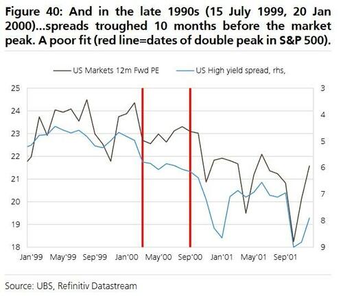 vii) credit spreads troughed 10 months before the market peak in 2000.
