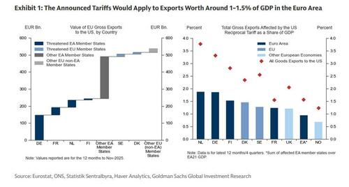 While implementation is highly uncertain - and according to Deutsche Bank, Europe could liquidate some of its record holdings of US assets as a deterrent to actual implementation - Goldman estimates that a 10% tariff would lower real GDP in the affected European countries by 0.1-0.2% via lower exports. At the same time, inflation effects would likely be very small and a Taylor rule would point to modestly lower policy rates, all else equal.