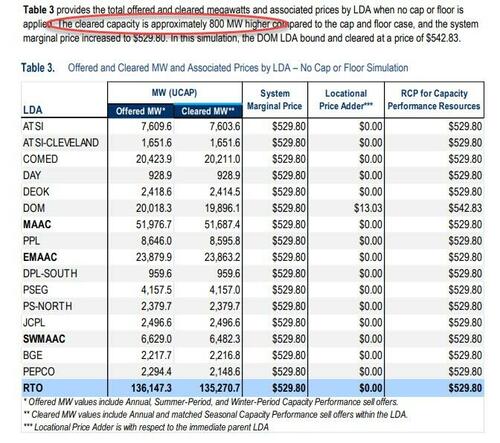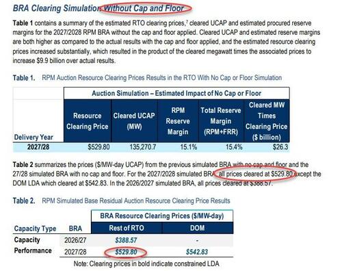 Yet what may be even more troubling is that even assuming fully unregulated markets, with no cap or floor, the "cleared capacity is approximately 800 MW higher compared to the cap and floor case." Which means that even at much higher prices, there is only less than 1GW capacity in the largest US grid system, which is catastrophic for an AI and data center cycle which expect dozens if not hundreds of GWs will be added magically over the next 5 years!