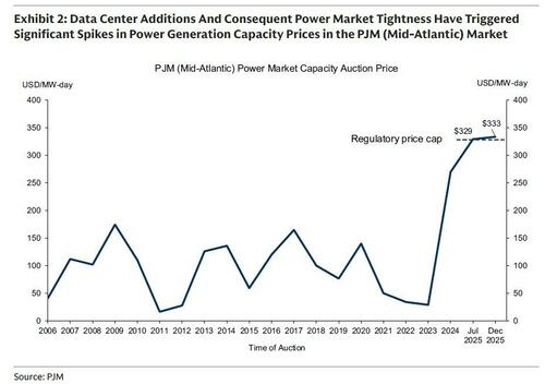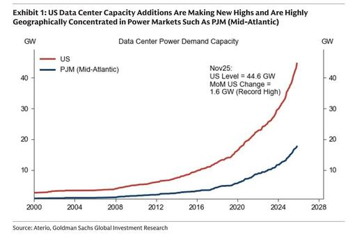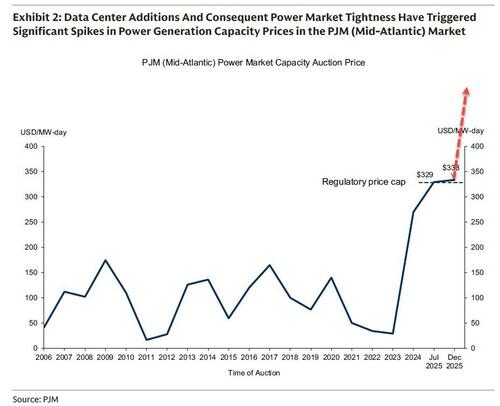 As Goldman notes, the rapid growth in US data centers has further tightened US power markets and has triggered spikes in real-time power prices last summer and power generation capacity prices in the PJM market.