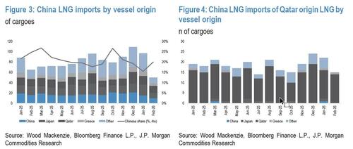 And the punchline: even if the above were circumvented and China succeeded in optimizing its fleet to prioritize Qatar cargoes, JPMorgan thinks it’s unlikely Qatar would restart LNG production to serve such limited volumes amid uncertainty about the medium‑term feasibility of this arrangement. And that's assuming the damage from today's Iranian attack can be fixed quickly.