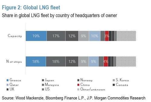This development prompted JPMorgan to ask (full note here) if such an arrangement could materially ease the disruption to LNG supply via the Strait?The bank's short answer: no. That's because of the 17 LNG vessels currently in the Persian Gulf, only two are owned by Chinese companies; at least one is not loaded, and both are insured in the UK.